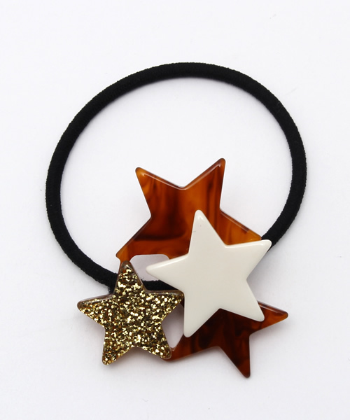 星が重なり合うおおぶりモチーフのヘアゴムはひとつまとめのヘアスタイルにぴったり。インパクトあるバックスタイルに仕上げます。使わないときは腕につけたり、バッグのハンドルにアクセサリーとしてつけてもキュート。ギフトとしてもぴったりです。