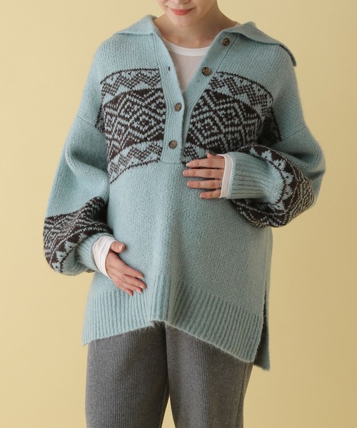 今年らしい襟デザインがポイントのノルディックニット【デザイン】身頃と袖に入った柄が目を惹く主役級のニットです!サイドにスリットが入っているのでお腹が大きくなってきてもすっきり見えが叶います。胸元は深めのボタン仕様なので授乳もしやすいデザインになっています!【スタイリング】・ベーシックなボトムはもちろん、カジュアルにスウェットパンツなどと合わせるのがおすすめです。---------------------------------------------------【気になる商品はお気に入り登録がおすすめ!】・在庫残りわずか・再入荷・セールの情報などの通知を受け取ることができます。気になる商品は♡をクリックして、「お気に入り登録」しましょう!【ショップ・ブランドのお気に入り登録も!】新商品や再入荷、セール、クーポンの配布など、いち早くお得な情報を受け取ることができます。---------------------------------------------------