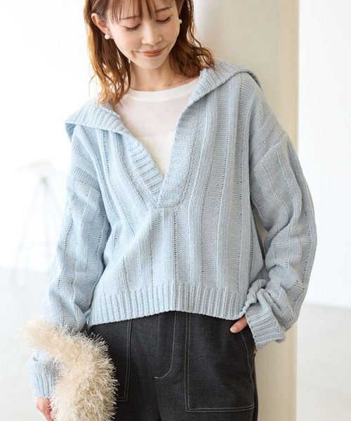 バックスタイルに注目。襟のデザインがキュートなニット。【素材感】 ・トレンドのモール糸にアンジェリーナラメを入れたニットプルオーバー。 ・モールニットを用いた、ふっくら素材。 【デザイン・シルエット】 ・セーラーカラー風の襟が爽やかな印象。 ・フロントボタンの開き具合で、印象チェンジが可能。 ・軽快なクロップド丈を採用。 【カラー】 ・チャコールグレー、アイボリー、ブルーのすっきりとした3色をラインナップ。 【スタイリングポイント】 ・マリンパンツにキャスケットで統一感のあるスタイルに。 ・ハイライズボトムを合わせると安心。 ・キャミソールワンピースなどの上から重ねる着こなしも一押し。 ----------------------------- 裏地:なし 透け感:なし 伸縮性:ややあり 生地感・厚さ:普通 季節:秋・冬 ----------------------------- ※撮影時の光、お使いのモニター環境によって色の見え方が違う場合がございます。 ※モデル身長:165cm 着用サイズ:38