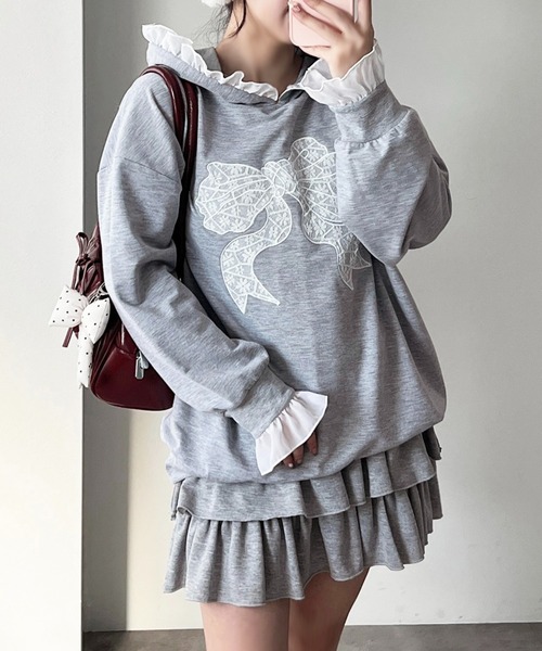 ◆トレンドのレースデザイン×スウェットでカジュアルガーリー♡ フロントにレースリボンがデザインされたトレンドアイテム。 スウェットはフード付きで、フードと裾口にはフリルが付いており、 甘さとカジュアルさを兼ねそろえた今季らしいデザインです! 柔らかい素材なのでゆるっとストレスフリーに着用でき、着心地も抜群◎ ショートパンツとロングブーツと合わせたミニ丈合わせが今季っぽく、 ゆるっとカジュアルガーリーな着こなしがおすすめです♩ ※素材 本体:ポリエステル65%,綿35% リブ:ポリエステル70%,綿27%,ポリウレタン3% シフォン:ポリエステル100% レース部分:ナイロン+ナイロンフィルム繊維55%,綿45% --------------------------------------- 透け感:なし伸縮性:あり 裏地:なし --------------------------------------- ※ご覧のモニター環境や撮影環境により 実際の商品と多少色味が異なって見える場合がございます。 ご理解の程よろしくお願いいたします。 【お買い物をよりお楽しみいただく為に♪】 ▼商品のお気に入り登録をおすすめします ♡をクリック! 完売カラーの再入荷や、ラスト1点の通知、 セールの際の通知を受ける事ができます。 ブランドのお気に入り登録も ご一緒にお願い致します。