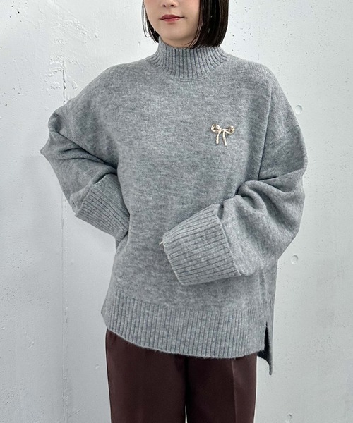 ■胸元のリボンブローチがアクセントに■ モチモチとした肌触りの良いハイネックニット。 胸元にはゴールドのリボンブローチ付きでフェミニンに。 前後差があるので気になるお尻周りも自然にカバーしつつ、 裾部分にはスリットが入っているので抜け感もプラス◎ 袖口は太めの折り返しデザインで、可愛らしいデザインになっています。 ーーーーーーーーーーーーーーー 透け感:なし 裏地:なし 伸縮性:あり 光沢感:なし 生地厚さ:普通 洗濯方法:手洗い可 ※詳しいお手入れ方法は商品についているタグをご覧ください ーーーーーーーーーーーーーーー ※ご利用のモニター環境により、実際の色味と多少異なる場合がございます。 … information … 欲しいitemをお気に入り登録(♡マークをclick) ・お買いのがし対策…完売itemの再入荷やラスト1点の情報をお知らせ ・欲しいitemをお得にget…price downになったらいち早くお知らせ ・スムーズ検索…ZOZOのお気に入りアイテムページで簡単checkできるから、再検索不要♪