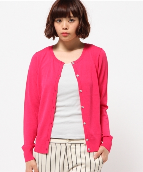レーション混のしなやかな風合いが使い勝手バツグンなニットカーディガン。ラウンドネックで優しい印象と、キラリと輝きを見せるクリアビジュー釦がアクセント!カーディガンと同色系の釦で統一感を演出しています。どんなボトムスにも好相性、肩掛けにも便利なアイテムです。