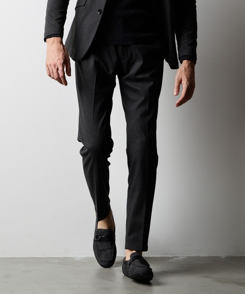 ■デザインイージーパンツ仕様のスラックスデザイン。素材感を活かしたシンプルな飽きの来ないデザインに仕上げています。同素材でジャケット「メーカー品番4565-3536」を展開しておりますので、セットアップでのスタイリングもおすすめです。■サイズウエストベルトには平ゴムとスピンドルを通していますのでサイズ調整しやすく、少しお尻廻りから渡りにかけてゆとりのあるサイズ感にしています。その渡りから裾口にかけてテーパードした綺麗なシルエットです。■素材表面がカルゼ柄のWフェイスカットソー素材に起毛をかけた紡毛調のウールライク素材。カットソーならではのストレッチ性が特長の素材です。ウールの様な厚みがありながら軽い着心地で、ポリエステルの張り感が仕立て映えする素材です。伸縮性:あり生地の厚さ:やや厚手裏地:背裏、前裏あり■注意点生地の性質上、摩擦によりピリングが起こることがあります。