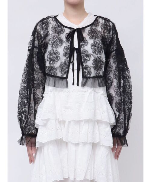 ※裾、袖口部分のフリルはチュールになります。 ■デザイン ふわふわと浮き出たトレンドのチュールが可愛いシアーブラウスです。デコラティブな要素がつまっていて、シアーなので重ね着もしやすい一着です。 ■サイズ感 ゆったりとした身幅です。 ■スタイリング 少し短めの丈なので、レイヤードでスタイルアップ効果があります。 【商品情報】 透け感:あり 裏地:なし 伸縮性:なし 光沢感:なし 生地の厚さ:うすい