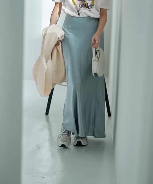 この長さが欲しかった! しっかりとロング丈で優美なラインを描く、 生地を贅沢に使用したグロウな艶スカート サテン生地をバイヤス使いにすることで、しなやかな動きを出した贅沢な作りのスカート。落ち感の良さと美しいとろみ感を出すことを重視しており、動くたびに優美なドレープが生まれます。 たっぷりと長い丈感であることもポイントで、今っぽいオシャレな雰囲気。どことなくマーメイド風のシルエットを持ち、穿くと女性らしい気持ちになれる一枚です。 ◆通年を通して使用できるスカート。夏のTシャツスタイルやサマーニット合わせなどに華やかさと女性らしさを加えてくれます。 ◆ジャケットやカーディガン、ブルゾン類にも合います。合わせる靴もあまり問いません。 ◆キレイめなアイテムともカジュアルなものとも合います。 ◆秋冬にはニット合わせやスウェット合わせなども素敵です。 ◆適度にゆったりとしたサイズ感。腰張りやヒップも極力目立たないようお作りしています。 ◆ウエスト背面ゴム使用。細いゴムなので締め付け感は弱く、よく伸びてウエストがラクな穿き心地です。 ◆丈詰めが可能で、ウエストを折り返して穿くのも可能です。背が低い方でも調節できます。 ◆バイヤス使いをしているサテン生地なので、平置き時と着用時で重力による寸法差が4cm程度生じます。01サイズは88cm→92cm/02サイズ94cm→98cmになるイメージです。基準として02サイズは163cm以上の身長が必要です。気にするほどではありませんが、微妙な個体差もあります。予めご了承ください。 【お知らせ事項】 こちらは生地の特性上、よく見ると小キズや繊維の飛び出し等が表面に生じます。モデル画像最後尾にその例を載せてありますのでご確認ください。 加工時にそのようになってしまうという特性があり、それらは着用時の印象に差を与えるようなものではなく、不良ではありませんので予めご了承いただくようお願いいたします。 【商品の特徴】 ◆着用時期:お好みで通年 ◆サイズ感:適度なゆとりのあるサイズ感 ◆丈感:足首が隠れる程度の丈感 ◆シルエット:マーメイドシルエット ◆ギャザー:背面ギャザーあり ◆スリット:なし ◆厚み:安心感のある厚み ◆柔らかさ:柔らかい ◆着用ジワ:できにくい ◆毛羽立ち:できにくい/摩擦の集中と着用頻度により、たまにおきることがあります ◆伸縮性:僅かにあり ◆光沢感:あり ◆透け感:なし ◆ボタン:なし ◆ファスナー:左サイドファスナーあり(上部ホックあり) ◆ベルトループ:なし ◆ポケット:なし ◆裏地:なし ◆手洗い:可能 ◆裾上げ:不可 ◆アイロン:可能(当て布使用。低アイロン) ◆ウエストゴム:背面ウエストゴム 【お色について】 ◆ブラック:通常の定番的なブラックです。 ◆ライトブルー:少し落ち着きを入れたトーンの明るいブルー。程よく光沢があるためくすみ感が出ずキレイです。 ◆マスタードゴールド:マスタードをイメージさせるような、落ち着きと高級感のあるシックなゴールド。