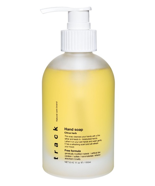 手肌の汚れをしっかり落としながらも、しっとり潤う、優しい香りのハンドソープ ------------------------------------- 香り:シトラスハーブ フレッシュなシトラスと穏やかなハーブの香り。洗うたびにハーバルな香りが広がります 【商品説明】 アミノ酸系・植物由来の洗浄成分が手肌の汚れをしっかり落としながらもやさしく洗い上げ、純米酒の酒粕(酒粕エキス)と和三盆の糖蜜(トウミツ)でしっとりとした潤いを与えます。数種類の海藻エキスとアロエエキスも配合し、手肌の潤いは逃さず、もっちりとした洗い上がりのハンドソープです。日々の暮らしを豊かにするホームケアアイテムとして、ギフトにもおすすめです。 【使用方法】 水で手をぬらした後、ハンドソープを手につけよく泡立てます。清潔なタオルなどで拭き乾かします。 ----------------------------------------------------- track(トラック)について ----------------------------------------------------- 心地のよい毎日をデザインする、ナチュラルケアブランド track は香りによる「気分」のデザイン、インテリアにも溶け込むパッケージの「空間」デザイン、環境配慮アイテムを使用した「習慣」のデザインにより、心地の良い毎日を追求した、ナチュラルなケアブランドです。 すべての人に楽しんでいただける、ジェンダーフリーなアイテムは、天然由来成分高配合のため、自然の恵みを感じることのできるヘルシー処方。 ブランド名である「track」は「足跡・軌跡」を意味しており、“今の自分をつくる過去” を否定せず、その全てを受け入れて進むことで、未来に向かって自分らしい足跡を残してほしいという思いを込めています。 -----------------------------------------------------