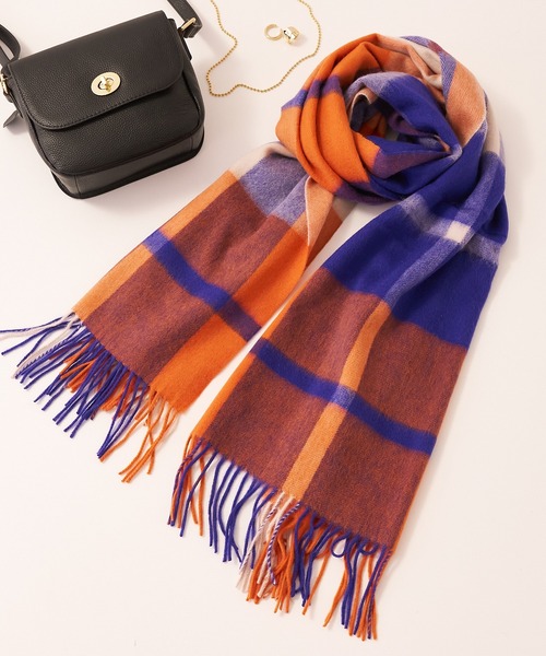 キャッチーなカラーでコーディネートの主役に ウールよりも軽くて暖かく柔らかいラムズウールのマフラーです。 ふんわりと優しい肌触り。 光沢感がありながら染色も美しく、ブルーとオレンジが映える柄です。 シンプルなスタイル合わせるだけでスタイリッシュな印象に◎