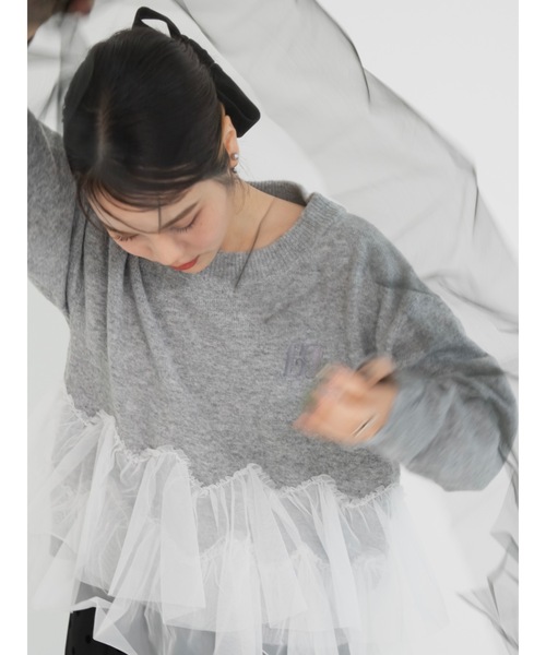 -バレエレディニット- 胸下からあしらったチュールのデザインが目を惹く ニットトップス。 秋~春まで長く着られる厚さのニットで もっちりとした肌触りが魅力。 素肌に触れても心地よい、しっとり感のある素材を使用しています。 トレンドのチュールは、 デイリーにも使いやすい絶妙ボリュームに。 波状に縫われたデザインがこなれ感を演出します。 胸元には、同色系の糸でロゴをプラス。 少し光沢のある刺繍糸が、 さりげなく目を惹くデザインです。 ・・・・・・・・・・・・・・・・・・・・・・・・・・・・・・・・・・・・・・・・・・・・・・・ ◆アイテム詳細 素材…本体:アクリル74% ポリエステル22% ポリウレタン4% 別布:ナイロン100% 透け感…なし 生地の厚さ…普通 伸縮性…あり 裏地…なし ・・・・・・・・・・・・・・・・・・・・・・・・・・・・・・・・・・・・・・・・・・・・・・・ ◆サイズ感 身長160㎝前後の方でぴったりサイズで着られるサイズ感。 丈はすっきりとした丈感で、気になるお腹はしっかりと隠しつつ、 脚を長く見せてくれる絶妙丈です。 ◆スタイリング 1枚で主役になるデザインで、 デニムやスラックスなどシンプルなボトムと合わせるだけで こなれ感のあるコーデに。 Iラインのスカートや、すっきりシルエットのパンツを合わせれば チュールのふんわり感がより際立ちます。 -キーワード- バレエコア チュール ニット ペプラム ドッキング 異素材 ガーリー 女子会 デート ディナー クリスマス 低身長 高身長 スタイルアップ 体形カバー