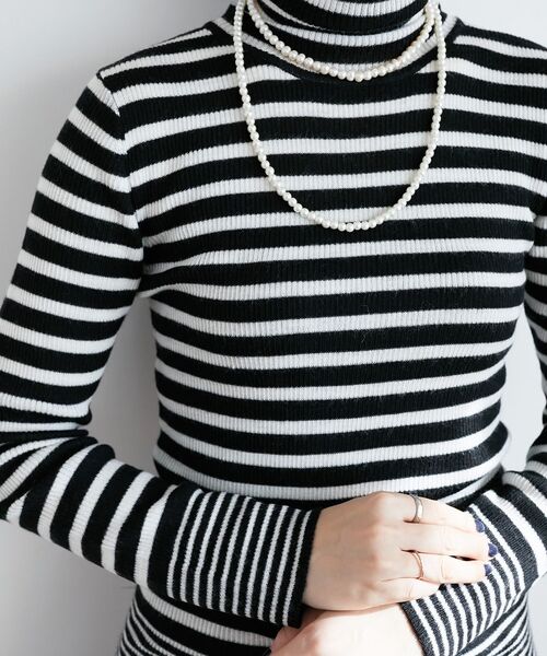 滑らかで柔らかい風合いのリブタートル。 レイヤードがマストな今シーズンも1枚あると大活躍間違いなしです。 ●ポイント ラメリブは角度で輝きを感じさせるラメ混紡仕立てで、ほんのりと女性らしさが香る大人スタイルに。ボーダー柄は袖口と裾のボーダーのピッチアレンジで遊び心をプラス。 ●おすすめコーデ 1枚で着るのはもちろん、ワンピースやサロペットのインナーにもおすすめです。 シャツやゆるめのニットとのレイヤードスタイルも楽しめます。