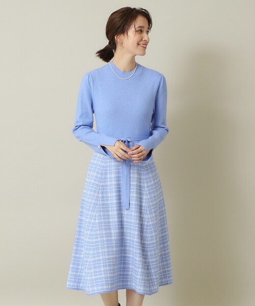 【デザイン】 ツイード調スカートがクラシカルな印象。 一枚で簡単にコーディネートが決まるニットワンピ。 秋冬らしい温かみのあるタッチ感の素材を使用したニットワンピース。 ツイード調に編んだスカートが秋冬らしいクラシカルなムードを盛り上げます。 コンパクトめな身頃からふわりと広がるスカートのフィット&フレアーシルエットで、 着るだけで簡単にドラマティックなコーディネートが完成。 袖口はスリットディテールにパール調のアクセントで大人のこなれ感を演出。 【素材】 柔らかな肌触りで温かみのあるタッチ感のニット素材です。 【仕様】 ・ポケットなし ・裏地なし ※こちらの商品はやや透け感があるため、インナーの着用をおすすめします。 ※照明の関係により、実際よりも色味が違って見える場合があります。また、パソコン・スマートフォンなどの環境により、若干製品と画像のカラーが異なる場合もございます。 モデル情報:身長166cm B80 W59 H85 着用サイズ:00(フリーサイズ) 店舗へのお問い合わせ商品番号:P93-59013 ●製品寸法: 00(フリーサイズ):着丈108cm B76cm 袖丈60cm 肩幅32cm W72cm H108cm 付属ヒモ全長170cm 付属ヒモ幅2cm 備考: