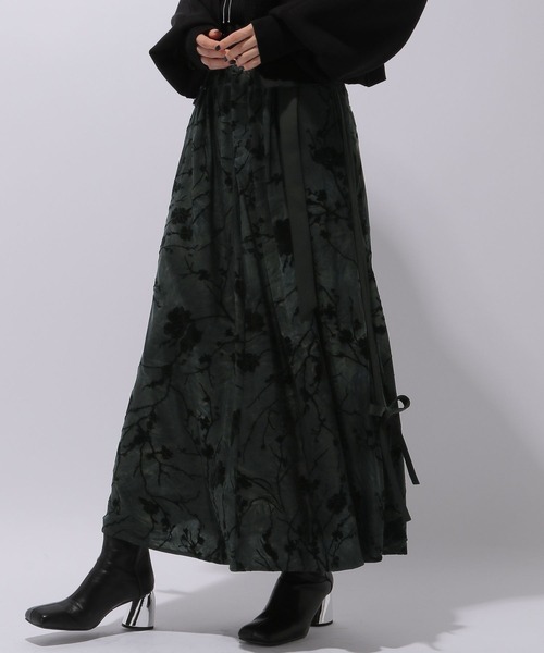 ーーー フロッキー加工×リボンラインがポイントのデザインスカート ーーー point □立体感のあるフロッキー加工を施した生地が特徴 □サイドラインデザインと結べる仕様の裾リボンで女性らしさをプラス □ウエストゴム仕様でストレスフリーな着心地 □ベルト付きでウエストマークができ、メリハリのある印象に □フレアシルエットで足さばきがしやすく歩きやすいのがポイント styling シャツやブラウス合わせが上品なスタイリングに。 ショート丈のアイテムと合わせるとスタイルアップ効果抜群です。 ※撮影環境により、光の当たり具合で 色味が違って見える場合があります。 あらかじめご了承下さい。