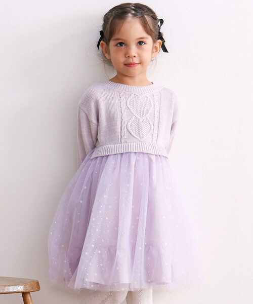 長袖ニットとチュールのスカートをドッキングしたワンピース。重ねたフワフワのチュールスカートはプリンセスやバレリーナみたいで女の子がキュンとするポイント♪チュールにほどこした雪の結晶柄のキラキラプリントは動くたびにきらめくアクセントになっています。ニット部分はハートが連なっているような編み目がキュート。細かいところまで可愛いにこだわったアイテムになっています。ガバッとかぶって着られるからお着替えも自分でできるのが◎ドッキングアイテムは1枚でコーデがキマって悩まなくていいのがうれしい!ちょっぴりおめかししてお出かけしたい時にオススメのアイテムです。落ち着いたブルー、おねえさんみたいなパープルの2色展開です。※裏地あり。※柄の出方は生地の裁断により一点一点異なります。2024年秋冬女の子アイテム。【2024年 11月のテーマ / wishing】誰かを思ったり、何かを贈ったり...愛と思いやりに満ちるとき。落ち着いた雰囲気やキラキラ輝くきらめきムードで【2024 AUTUMN / WINTER New custom Make special】いつもの日常を特別なものにするために、表情豊かな素材感やテクスチャー、カラーでNew custom!楽しみ・癒し・あたたかさ、日常に寄り添える服を【SLAP SLIP(スラップ スリップ)】~子どもの欲しいをカタチに~ヨーロッパのこどものように子どもらしい今しか着れないナチュラルなかわいさを提案どこか上品で清楚感漂うフレンチカジュアルはいつものコーディネートをさりげなく格上げ