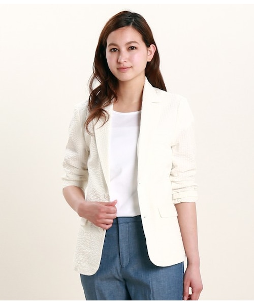 【きれいめスタイルからカジュアルまで幅広いコーディネートにマッチ】ベーシックなフォルムのテーラードジャケットを表面感のあるサッカーストライプ生地で仕立てました。見た目にも爽やかさを感じる存在感が魅力☆シンプルなTシャツ&フレアスカートで可愛らしく着こなすのはもちろん、ショートパンツでマリン風にコーディネートするのもおすすめです。
