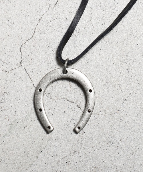 馬蹄型のチャームが付いたネックレス。革紐とのコンビネーションがネイティブな雰囲気を醸し出しています。 アメカジで古くから使われているモチーフを使用し、メンズライクなネックレスに仕上がっています。
