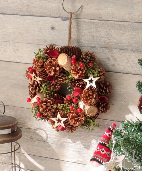 天然素材を使用した、ボリュームのあるリース。 玄関ドアや壁にかけたり、手軽にクリスマスムードを演出してくれます。 【ポイント】 星モチーフ付きの松ぼっくりや、フェイクグリーンを使用。 ※一点一点に微妙な色・サイズ・風合いなどの違いがございます。