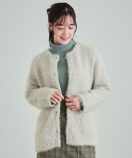 【デザイン】 ふわふわとしたフェザー素材が上品でフェミニンな印象を与えてくれる パール調ボタン付きのカーディガン。 開きすぎないクルーネックデザインに程よいゆとりと長めの丈で、大人な印象を与えてくれます。 フロントにはポケットもついています。 ・ポケット数:前×2 【スタイリング】 カーディガンとしていつものコーディネートやワンピースに羽織っていただくのはもちろん、 ボタンを留めて一枚のニットとして着ていただくのもおすすめです。 程よくゆとりがあるサイズ感なのでタートルネックやシャツなどのインナーを入れた レイヤードコーデもおすすめです。 長すぎない着丈なので、ボトムはパンツ、スカートどのアイテムとも好相性。 アイボリーやライトグレーは女性らしいスカートやワンピースに合わせていただいたり、 ブルーは大人っぽくワイドパンツなどのスタイルに合わせていただくのがおすすめです。 ブラウンはカジュアルにデニムと合わせた着こなしにも。 【お客様からいただいたコメント】 ・大きすぎるほどではないですがゆったりめで、アウター代わりにもなり重宝しています。 綺麗なライトブルーで一目惚れです。 (身長:165cm 体型:やせ型 ブルー購入) とのお声を頂戴しております。 【素材】 毛足のあるふわふわとしたフェザー素材 2種類の糸を使用したダブルフェイスの手法で編み立てており、表側は程よい毛足のフェザーヤーン糸で裏側はポリエステル糸を使用しています。 ダブルフェイスの暖かさと、表面のふわふわとした毛並みが シーズンムードを一気に高めてくれます。 モデル情報:身長166cm B81 W57 H86 着用サイズ:00(FREE) 店舗へのお問い合わせ商品番号:741-39020 ●製品寸法: 00(FREE):着丈64cm B100cm 袖丈51cm 肩幅40cm 備考: