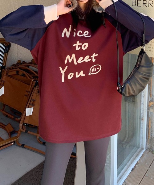 「Nice to Meet You」の文字が目を引く、ラグランスリーブデザインのスウェット。 柔らかく着心地の良い素材を使用しており、リラックスしたカジュアルなスタイルを楽しめます。 カラーの切り替えデザインが特徴的で、シンプルながらもおしゃれなアクセントになっています。 デイリーユースからお出かけまで幅広く活躍するアイテムです。