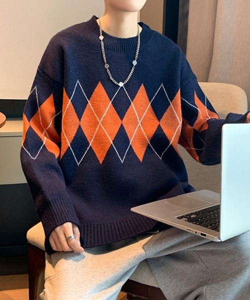 【NOWLE】アーガイル柄 プルオーバー ニット セーター ビッグシルエット■ レトロとモダンが融合する主役ニットクラシックなアーガイル柄を現代的なリラックス感のあるシルエットに落とし込んだプルオーバーニットです。伝統的な柄の持つ上品な雰囲気を保ちつつ、ゆったりとした着心地がリラックス感と旬のムードを演出します。一枚着るだけでコーディネートの主役になり、秋冬のスタイリングを格上げしてくれるアイテムです。■ 際立つカラーコントラストで魅せるネイビーと鮮やかなオレンジ、シックなブラックとアイボリーのコントラストが目を引くデザインです。アーガイル柄を構成するそれぞれの色のバランスが計算されており、暗くなりがちな秋冬の装いに程よい華やかさをもたらします。着こなしにメリハリを与え、周りと差のつく個性的なルックを楽しめます。■ 暖かさとゆとりある着心地を提供するシルエット厚みのあるニット生地は見た目にも暖かく、肌寒い季節に心地よさを提供します。ドロップショルダーと程よいゆとりのある身幅が特徴で、体型を選ばずにストレスフリーな着こなしを可能にします。インナーにTシャツやシャツを重ねたレイヤードスタイルも楽しめ、着こなしの幅が広がるのも魅力です。■ カジュアルからきれいめまで自在な着回し力スウェットパンツやデニムと合わせてリラックス感のあるカジュアルスタイルはもちろん、きれいめのスラックスやチノパンと合わせれば、柄の上品さが引き立ち、洗練された大人の着こなしが完成します。また、アクセサリーとしてネックレスをプラスすることで、首元にアクセントが生まれ、さらに都会的な印象を高めることができます。幅広いボトムスと相性が良く、毎日のコーディネートに取り入れやすい万能な一着です。【NOWLE(ノウル)】now+owlの造語で幸福の鳥owl(フクロウ)をモチーフにしたブランド名"今"と"幸福"を大切にという想いを込めて立ち上げたセレクトブランドです。【NOWLEの新着情報について】▼商品のお気に入り登録完売カラーの再入荷通知や、ラスト1点の通知、セールの通知も受け取ることができます。▼ブランドのお気に入り登録新商品や再入荷等、いち早く"NOWLE"のお得な情報を受け取ることができます。※当商品の画像はサンプルです。実際の商品とは一部仕様が異なる場合がございます。また、ご利用のモニター環境や撮影条件により、色味が異なって見えることがございます。何卒ご了承ください。CZ_0008