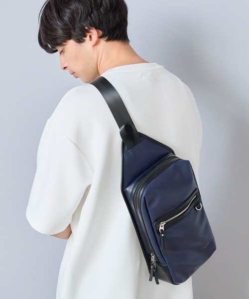 ZIPデザインがポイントのボディバッグ。 メインポケットはダブルジップで開け閉めしやすくなっており、収納力も◎ フロントと背面、内側にもポケット付きなので、小物の収納にも便利です。 シンプルなデザインで、クリーンにもカジュアルにも合わせやすいアイテム。