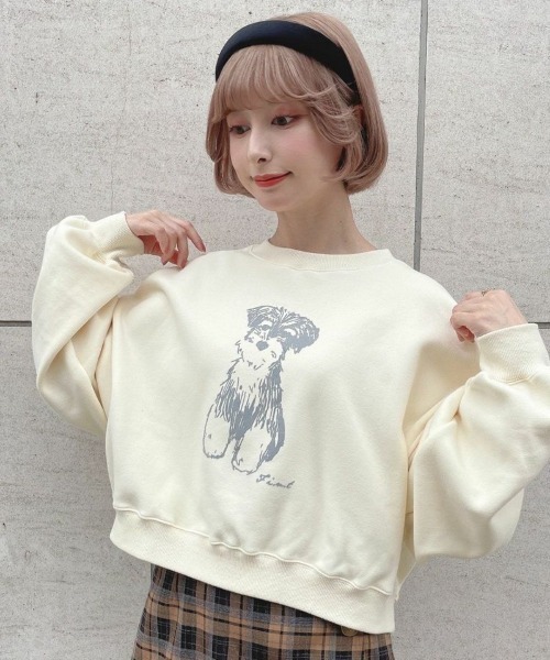 ■デザインポイント 愛らしいシュナウザーのプリントスウェットがお目見え♡ 手描きタッチのイラストには、表面に起毛感のあるフロッキープリントを施し、思わず撫でたくなるような愛らしい仕上がりにこだわりました♪ ショートな丈感とボリューム感のある袖がトレンドライクで今っぽいシルエットに◎ 裏起毛仕様のため着用感も暖かく、ゆるっとしたサイズ感で着心地抜群です。 ■オススメスタイリング プリーツミニスカートを合わせてトレンドライクに着こなすのがオススメ! ルーズなシルエットのパンツやデニムボトムで思いっきりカジュアルにコーデを楽しむのも◎ ====== 透け感:なし 裏地:なし 生地感:裏起毛感あり ====== ※アイロンは当て布を使用してください。 ▼Fint/フィント 50~70年代のクラシカルなヴィンテージデザインにトレンド感をプラスしたレトロ&ガーリースタイルをお届け。 古着屋で一点ものを見つけるような【ときめき】を感じられるブランドです。 70s~90sストリートからイメージしたアイテムにレトロ&ガーリー要素をMIXした トレンド感あるカジュアルアイテムが揃う「Pink Label」のアイテムも展開中! ▼商品のお気に入り登録▼気になるアイテムの♡をクリックしてお気に入り登録すると残り1点の通知、完売カラーアイテム再入荷の通知、お得な通知が届きます。 ▼ショップお気に入り登録▼ ショップからの新作商品やお得なイベント情報など、いち早くブランドからの情報を受け取ることができます。