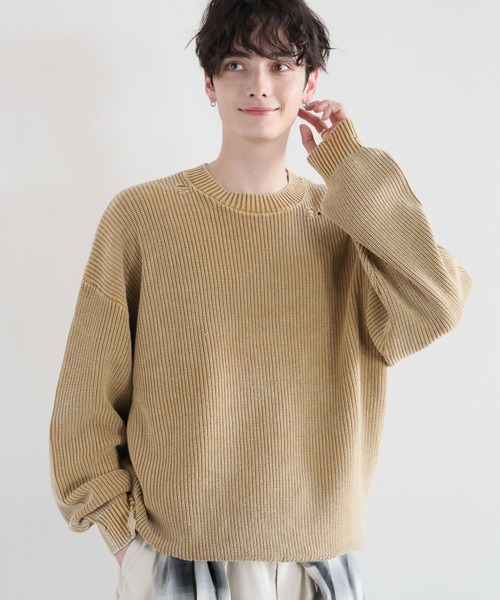 ーーー ■ポイント ・ダメージ/ピグメント加工が施された、古着のようなローゲージニット。 ・畔編みニットを使用することで、季節感のある柔らかな着心地です! ・袖口にボリュームのあるシルエットなので、1枚でトレンド性抜群です。 ■デザイン・シルエット ・ピグメント加工を施した、古着のような味のあるニットです。 ・袖口に溜まり感のあるオーバーサイズなので、着るだけで様になる1着。 ・ところどころにあしらわれたダメージ加工が、アクセントに◎ ・程よい締まりのリブを内側に折ることで、流行りの短丈シルエットもお楽しみ頂けます。 ■素材 コットン/綿100%でお作りしたローゲージニット。 アゼ編み織りでお作りしたニットは、程よくざっくりとしたカジュアル感のある風合いに◎ 丈夫な生地を使用しているので、ご自宅でもハンドウォッシュが可能です! ====== ■参考サイズ M:~175cm L:175cm~ ====== ーーー ■スタイリング 加工感がスタイリングのアクセントになるニット。 古着の代名詞であるデニムと合わせれば、落ち着きのあるカジュアルスタイルに。 カーブパンツと合わせたボリューム感のあるスタイルも今年らしい雰囲気で◎