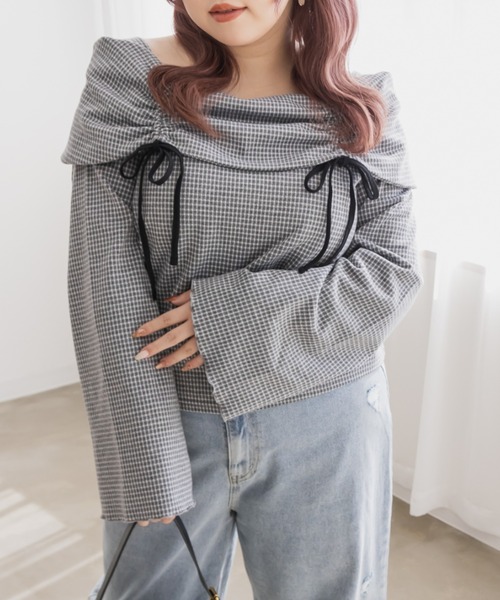 ◆商品ポイント◆・綺麗に開いたネックラインは下着の肩紐が見えない安心デザイン。リボンがポイントになってバストもすっきりとした印象に。腕を細く・長く見せるフレア袖もポイント◎ ・大人っぽくまとまる落ち着いたチェック柄。伸縮性があるから着心地もストレスフリー。 ◆maika:161cm/普段トップス3L・ボトム3L~4L着用 着用コメント◆ 3Lサイズを着用してちょうどいいサイズでした。ネック回りが綺麗に開きながら、下着の肩紐が見えないようなデザインになっています!オフショルは苦手だけど女性らしいデザインを探している方におすすめです◎黒のリボンがアクセントになっていて、すっきりとした印象になれます。袖もフレアに広がっていて女性らしさたっぷりです。パンツともスカートも相性のいい、大人っぽい1枚です! ◆サイズ◆ 着丈 55/56/57.5 バスト 101/107/115 裾周り 105/112/119 袖口 40/42/44 裄丈 81/82/83 ◆生地について◆ 裏地無し 透け感無し 伸縮性有り ◆洗濯表示◆ 液温は、40°Cを限度とし、洗濯機で非常に弱い洗濯処理ができる。 漂白処理はできない。 洗濯処理後のタンブル乾燥処理はできない。 日陰でのつり干し乾燥がよい。 底面温度 150°Cを限度としてアイロン仕上げ処理ができる。 石油系溶剤(蒸留温度150°C~210°C、引火点38°C~)でのドライクリーニング処理ができる(弱い処理)。 ウエットクリーニング処理ができる(非常に弱い処理)。 ◇◇◇ CLETTEについて ◇◇◇ ぽっちゃり体型、大きいサイズの方が『この服でいいや』ではなく『この服が可愛い』『この服を着たい』と思ってもらえるようなアイテムをお届けしています。CLETTEだけでしか購入できないオリジナル商品を是非一度手に取ってみてください◎