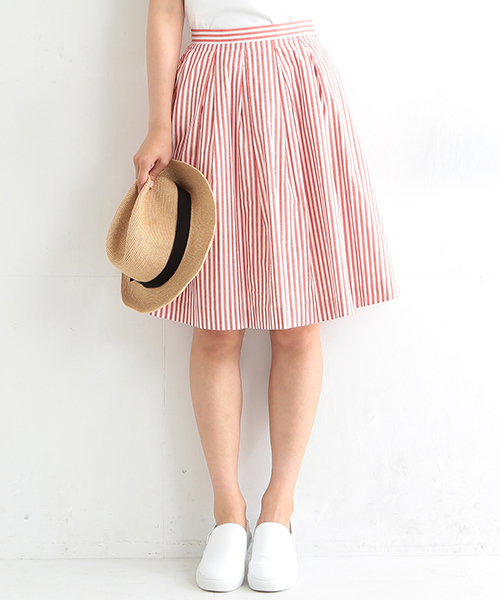 ふんわりとしたフレアシルエットが女性らしいストライプ柄スカート。細いピッチのグレーと、ピッチ太めのネイビー・レッドの3色展開でご用意致しました。 トップスをスカートにインしたスタイリングや、着丈短めのものを合わせるのがおすすめ。足元は上品なヒールサンダルからカジュアルなスニーカーまで、幅広い着こなしを是非お楽しみください。 店舗へお問い合わせの際は下記品番をお伝えください。 品番:52-27-0312-012