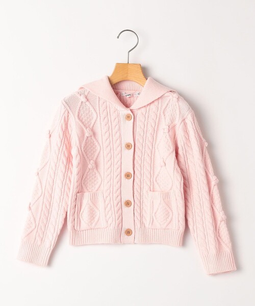セーラーカラーがポイントのケーブルニットカーディガンです。 身頃と袖は、ポップコーン編みが可愛らしい立体感のある表情豊かなデザインに仕上げました。 肌が繊細なキッズにも嬉しい、やわらかく滑らかな肌触りで着心地も◎ 秋冬の雰囲気にマッチする、優しいストーンとピンクの2色展開でお届け。 羽織としてはもちろん、釦を閉じてカーディガンが主役になる着こなしもお楽しみいただけます。 前立ての木彫り釦と両脇の小さいパッチポケットもポイント♪ ネットを使用し、ご自宅の洗濯機でも洗濯可能なため、デイリーユースにもおすすめの一着です。
