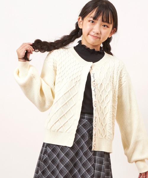洗濯機でもお洗濯できるニットのカーディガン。サテンテープのロゴプリントがポイントです。編地の模様も左右で違っているのがおしゃれ感をだしています。柔らかな手触りでおすすめのアイテムです。 ●生地の厚さ:やや厚め●裏地:なし●ポケット:なし●伸縮性:あり●透け感:なし