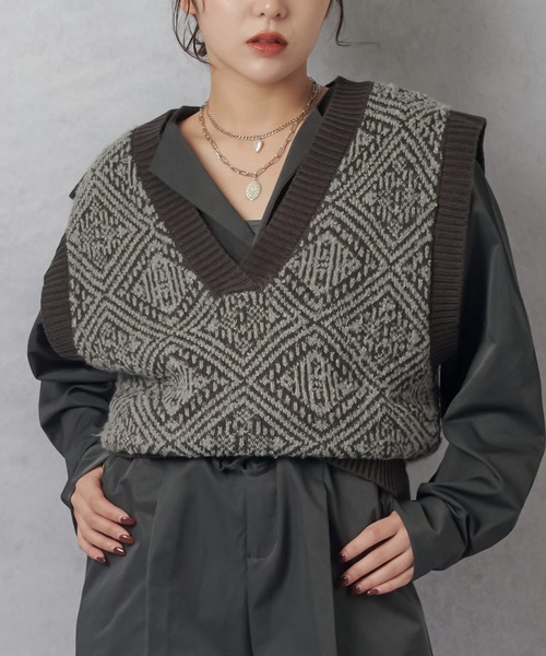 【秋冬コーデを格上げするジオメトリック柄ニットベスト】▼おすすめポイント1.クラシックなジオメトリック柄デザイン モノトーンカラーの幾何学模様が施されたデザインで、シンプルなアイテムと合わせるだけでコーデにアクセントをプラスします。柄の繊細さが洗練された印象を演出し、トレンド感のあるスタイリングが楽しめます。2.スタイリッシュな深めのVネック 深めのVネックがデコルテラインを美しく見せ、シャツやタートルネックなどとのレイヤードスタイルもすっきりとした印象に。1枚でさまざまなインナーと合わせて、着こなしの幅が広がります。3.程よい厚みでシーズンライクな仕上がり 秋冬に適した厚手のニット素材が、暖かさと着心地の良さを両立。軽やかで動きやすく、アウターの中にも取り入れやすいアイテムです。カジュアルからキレイめまで幅広く対応します。このジオメトリック柄ニットベストは、シンプルなアイテムと合わせてトレンド感のあるスタイルを楽しむことができ、秋冬コーデの主役にぴったりです。-----------------------------------透け感:なし厚さ:普通伸縮性:あり洗濯方法:ドライクリーニング可能-----------------------------------※詳しいお手入れ方法は、商品タグをご確認ください。※素材の性質上引っ掛かりが生じやすいため、着用・着脱の際はアクセサリー等の突起物にご注意下さい。▼お悩みの方に------------------------------〇アイテムのお気に入り登録気になっているアイテムの色、サイズの♡をクリックして、ラスト1点を通知でお知らせします欲しかったアイテムの♡をクリックすると再入荷の通知でお知らせします。------------------------------〇ショップのお気に入り登録ショップページの♡をクリックすると、新商品、人気アイテムの再入荷など、お得な情報を受け取ることができます。------------------------------▼注意点※掲載画像(商品、モデル着用とも)につきまして、撮影環境やお客様の閲覧されますパソコンや携帯電話キャリアによって、実際の商品とは多少異なった色に見える場合があります。また表示のサイズ感も実物とは若干異なる場合もございますので、予めご了承ください。※タグ・バーコードのついたシールには、サイトのご案内と異なるカラー名が記載されていることもございます。ご了承ください。