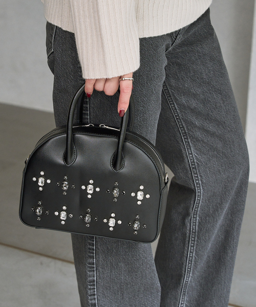 存在感のあるビジューを散りばめたレディライクなデザインのボストンバッグ。Wファスナーで開閉出来るので荷物が取り出しやすく機能的。落ち着いたカラーのビジューを使用し、程良い存在感でシーンを選ばずお使いいただけます。取り外し可能のショルダーストラップ付きなのも嬉しいポイント。*ビジューは摩擦や引っ掛かりにご注意ください。*照明の関係により、実際よりも色味が違って見える場合があります。またパソコン・スマートフォンなどの環境により、若干製品と画像のカラーが異なる場合もございます。*商品の色味は、商品アップ画像をご参照ください。本体:洗濯不可