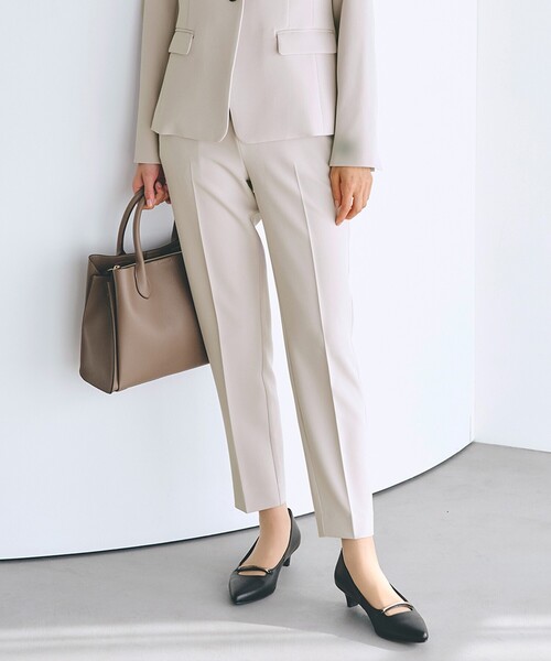 ハレの日にもデイリーにも しなやかストレッチスーツシリーズ 1.富んだストレッチ性 縦、横ともに伸びる2WAYストレッチ素材に進化し、リラクシーな着心地を実現しました。 2.イージーケア ご自宅の洗濯機洗いが可能なうえ、防シワ性も備えています。 ハレの日はもちろん、働く女性のデイリー使いにも嬉しいアイテムです。 【デザイン】 ノータックですっきり見えするテーパードパンツ。 裾に向かって緩やかに細くなるシルエットで、センタープレス入りできちんと感もあり、縦のラインが強調されることで脚がまっすぐ見えするデザインです。 後ろベルト中心にはゴムで伸縮性を持たせているので、座った時にもウエストを圧迫せず着心地良く着用いただけます。 【素材】 縦横ともに伸縮する2WAYストレッチのダブルクロス素材。 防シワ性も兼ね備えており、お洗濯時、着用時のシワがつきにくいのも嬉しいポイントです。 【スタイリング】 同素材でのジャケットとのセットアップ着用はもちろん、単品使いも活躍します。 〈しなやかストレッチスーツ シリーズ〉 768‐42005 カラーレスジャケット 768‐62002 テーパードパンツ 768‐62009 ワイドパンツ 【仕様】 ・ポケット数:横×2 後ろ×2 ・前ファスナー ・ウエスト後ろゴム ・裏地なし ※照明の関係により、実際よりも色味が違って見える場合があります。また、パソコン・スマートフォンなどの環境により、若干製品と画像のカラーが異なる場合もございます。 【24AW】 【25SS】 モデル情報:身長166cm B80 W59 H86 着用サイズ:02(M) 店舗へのお問い合わせ商品番号:768-62002 ●製品寸法: 00(SS):W63~70cm H88cm 股下64cm 前股上27cm 渡り幅28cm 裾幅15cm 01(S):W66~73cm H91cm 股下65cm 前股上28cm 渡り幅29cm 裾幅16cm 02(M):W69~76cm H94cm 股下66cm 前股上28cm 渡り幅30cm 裾幅17cm 03(L):W69~79cm H97cm 股下67cm 前股上28cm 渡り幅32cm 裾幅17cm 04(LL):W72~82cm H100cm 股下68cm 前股上29cm 渡り幅33cm 裾幅18cm 05(3L):W75~85cm H103cm 股下68cm 前股上29cm 渡り幅34cm 裾幅18cm 備考: