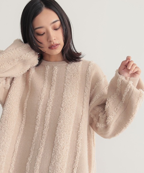 微配色のループヤーンを使用し、ふっくら立体的なストライプ柄になるようこだわったニットトップス。あえてリブ部分を細めにした裾や袖全体にもストライプを施し、スッキリ見えするシルエットです。くるくるとした輪が連なるようにして紡がれた素材と、少し起毛感のある糸をジャカード編みにし、寒い季節にぴったりなしっかりと厚みのあるニットに仕上げました。合わせ方次第でカジュアルにもキレイめにも着回せる万能ニット。ナロースカートにショートブーツで合わせたり、デニムにスニーカーのシンプルなコーデもおすすめです。