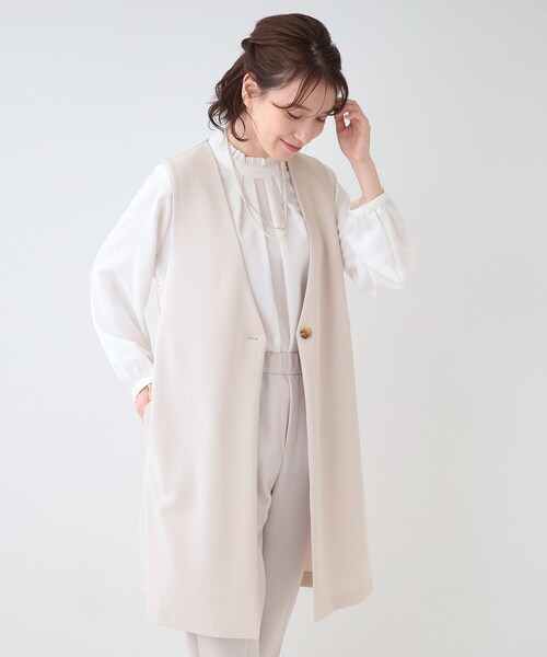 お仕事、セレモニー、デイリーにも。幅広いシーンで本当に使えるすっきりシルエットに進化したジレが登場。【デザイン】シルエットは縦ラインを強調したIライン、開けても閉めてもきれいに決まる深めVネックライン、ポケットはシーム(脇の切り替え部分)仕様で、昨年モデルよりすっきりしたラインに進化しました。フォーマルなシーンから、通勤、デイリーまで着回せるワンボタンのシンプルなデザイン。ボリュームスリーブの上にも羽織りやすく、体型をすっぽり隠してくれるのもうれしいポイント。1枚羽織るだけで今年らしさとこなれ感が出せるアイテムです。※ポケット数:横×2【スタイリング】パンツにもスカートにも合わせやすい、サッと羽織るだけでサマになる長すぎず短すぎない着丈にしています。ワンピースの上にサッと羽織っても素敵です。春・秋はブラウス、夏はTシャツ、冬はニットなどにプラスオンしやすく、オールシーズン使えるアイテムです。同素材のセットアップでフォーマルシーンや通勤時などのシックな着こなしから、デニムやストレッチボトムなどデイリーなカジュアルスタイリングまで幅広く対応可能です。【素材】上品なシボ感とさらりとした肌触り、ドレープが魅力のジャージ素材。伸縮性があり、シワが目立ちにくいジャージ素材を使っています。布帛見えでフォーマル感もありつつ、ジャージならでは膨らみ・軽さで、カジュアルスタイルにも相性よい素材感です。オケージョンからデイリーシーンまで幅広く使っていただけます。※裏地なし※同素材で テーパードパンツ(C62-62600)、ワイドパンツ(C62-62601)、ジャケット(C62-42600)をお作りしています。※照明の関係により、実際よりも色味が違って見える場合があります。また、パソコン・スマートフォンなどの環境により、若干製品と画像のカラーが異なる場合もございます。#通勤#セレモニー#ママスーツ#入卒#卒園式#卒業式#入学式#入園式#学校訪問服#パーティドレス#フォーマルレディス#結婚式#七五三#ママ#母スーツモデル情報:身長166cm B80 W59 H85 着用サイズ:02(M)店舗へのお問い合わせ商品番号:C62-22600●製品寸法:01(S):着丈88cm B94cm 肩幅35cm02(M):着丈90cm B97cm 肩幅36cm03(L):着丈92cm B100cm 肩幅37cm04(LL):着丈94cm B103cm 肩幅38cm05(3L):着丈94cm B106cm 肩幅39cm備考: