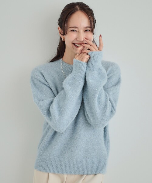スパンコールが印象的な華やぎニット 【デザイン】 さりげないきらきら感で大人可愛く決まる、気分高まる一枚。 程よく散りばめられたスパンコールが華やかな印象にしてくれます。 カラーによってスパンコールの色が違うのもポイント。 毛足の長いフェザーながら、落ち感があるので着膨れしにくくすっきりシルエットに。 【スタイリング】 チュールのスカートやナロースカートを合わせていただくと、大人フェミニンな雰囲気で着ていただけます。 アイボリー(004カラー)やサックスブルー(090カラー)はホリデーシーズンのお出かけにおすすめです。 グレー(012カラー)はきれいめにもカジュアルにもマッチ。 イエロー(032カラー)は暗くなりがちな冬のコーデも華やかにしてくれます。 丈感やクルーネックがスッキリとした印象を与えてくれるので、 デニムやワイドパンツ、スカートなど幅広いアイテムとマッチします。 【お客様からいただいたコメント】 ・キラキラのラメ糸と小さなスパンコールがキラっと光り上品で可愛いです。 フワフワで肌触りも良く色違いが欲しくなりました。 (身長:170cm 体型:普通 グレーのLLサイズ購入) ・スパンコールがキラキラしていて可愛く着丈もちょうど良かったです。 ふわっとしてて着心地もよく肌触りも気持ちいいです。 (身長:150cm 体型:普通 サックスブルーのMサイズ購入) とのお声を頂戴しております。 【素材】 ふわふわとしたフェザーヤーン素材にスパンコールを散りばめたニット素材。 ※照明の関係により、実際よりも色味が違って見える場合があります。また、パソコン・スマートフォンなどの環境により、若干製品と画像のカラーが異なる場合もございます。 モデル情報:身長163cm B81 W59 H88 着用サイズ:02(M) 店舗へのお問い合わせ商品番号:741-19021 ●製品寸法: 01(S):着丈55cm B95cm 袖丈56cm 肩幅40cm 02(M):着丈57cm B98cm 袖丈57cm 肩幅41cm 03(L):着丈59cm B101cm 袖丈58cm 肩幅42cm 04(LL):着丈61cm B104cm 袖丈59cm 肩幅43cm 備考: