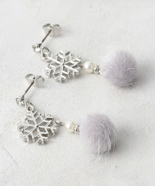 雪の結晶モチーフのメタルパーツとふんわりとしたシャギーボールを組み合わせたピアス。【デザイン】雪の結晶モチーフのメタルパーツとシャギーボールを組み合わせたピアス。パーツが歩くたびに揺れて、耳元のアクセントになります。※照明の関係により、実際よりも色味が違って見える場合があります。また、パソコン・スマートフォンなどの環境により、若干製品と画像のカラーが異なる場合もございます。店舗へのお問い合わせ商品番号:769-89172●製品寸法:00:全長4cm モチーフH1.4cm モチーフW1.3cm備考: