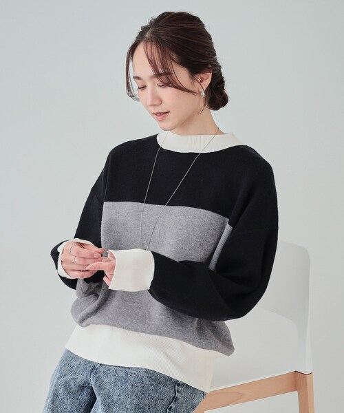 【デザイン】 大胆なカラーブロッキングがポイントのニットトップス。 襟、袖口、裾のカラーがポイントになっています。 程よくゆったりとしたサイズ感と、開きすぎない首元のデザインが大人が着やすい一枚です。 【スタイリング】 一枚で存在感がある柄ニットなので、シンプルなボトムと合わせていただくのがおすすめです。 プリーツスカートやチュールスカートのような女性らしく表面感のあるアイテムとも相性の良いアイテムです。 デニムなど定番スタイルにも合わせやすく、スタイリングの幅が広がる1枚です。 【お客様からのレビュー】首元が暖かくとても着心地がいいです!とってもお気に入りです。(オフホワイトMサイズ購入/身長158 /普通体型) 【素材】 もちもちとした肌触りで着心地の良いニットです。 ※照明の関係により、実際よりも色味が違って見える場合があります。また、パソコン・スマートフォンなどの環境により、若干製品と画像のカラーが異なる場合もございます。 #CutieBlonde#Cutie#cutieblonde#cutie#キューティブロンド#キューティ モデル情報:身長163cm B81 W59 H88 着用サイズ:02(M) 店舗へのお問い合わせ商品番号:256-19309 ●製品寸法: 01(S):着丈58cm B110cm 袖丈46cm 肩幅55cm 02(M):着丈59cm B113cm 袖丈47cm 肩幅56cm 03(L):着丈61cm B116cm 袖丈49cm 肩幅58cm 04(LL):着丈63cm B120cm 袖丈51cm 肩幅60cm 備考: