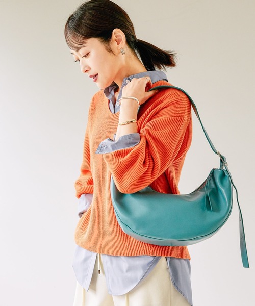 コーディネートの外しアイテムにぴったり 柔らかく滑らかな表面感の生地で身体に沿う形が使いやすい。 ショルダー部分は数段階に調整可能で、斜め掛けはもちろん肩掛けやハンドバッグとしても使用可能。 アクセントになるショルダー部分を垂らしてコーディネートのポイントにするのもおすすめです。 カジュアルなスタイルやきれいめコーディネートの外しアイテムとしても活躍します。
