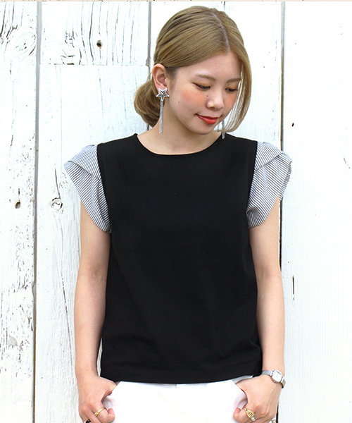 ◇袖のスリーブがかわいいデザインスリーブT ややジャストサイズなTシャツの裾がストライプのスリーブになったかわいい1枚。 シンプルになりがちな夏のコーディネートに存在感を出してくれるアイテムです。 肩の部分がふわっとしたデザインになっているので肌の密着も少なく汗などが気になる方にも安心してお使いいただけます。