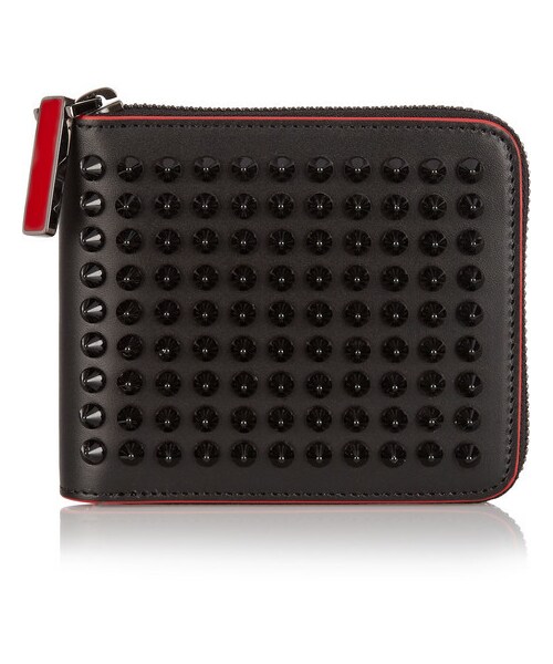 Punctuated with glossy spikes , Christian Louboutin's 'Panettone' wallet is crafted from black leather . The red trim and lining is a nod to the brand's iconic lacquered soles. Designed with four card slots, a coin pocket and bill compartment, this compact style fits easily into your favorite tote. Black and red leather (Calf) Zip fastening along top and sides Comes with dust bag