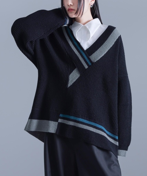 ■デザイン アシンメトリーに重なったVネックが個性的なニット。配色のラインもアシンメトリーにデザインし、ひとクセのある一枚に仕上げました。ゆるっと着やすいチュニック丈と、インナーをレイヤードしやすい深めのVネックで、肌寒い季節の着回しの幅が広がります。 ■コーディネート モードなデザインながら落ち着いた配色感で合わせやすい一枚。インにはシンプルなシャツやカットソーをレイヤードするのがおすすめです。ボトムスはワイドパンツでかっこよくまとめたり、スカートでバランスをとるのも◎ デニムやスニーカーでカジュアルに寄せてもお洒落に決まります。 ■素材 柔らかく肌触りの良い、軽い着心地のアクリルニット生地。程よい厚みで暖かくご着用いただけます。 ■製品についての注意書き ニット製品につきまして。 ニット素材の持つ特性として編み上げる行程やプレス仕上げによって多少サイズや風合いの個体差が生じる場合がございます。 着用した時と実寸の長さが変わる可能性がございます。 また、着用の際ピリングが避けられず、完全に防止することはできません。毛玉取り器等で丁寧に取り除いてください。 ローゲージニットにつきまして。 やわらかな糸を合わせて編むことにより、独特のざっくりした風合いを出しております。製品の特性上、ざらついたものに引っかかりやすく糸が飛び出すことがございます。 ご了承の上、ご購入いただきますようお願いいたします。