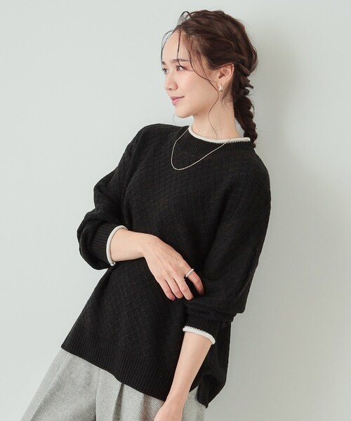 【デザイン】 きれいめで上品な細かいダイヤ柄ケーブルのニットです。 襟元と袖口に施した配色ラインがアクセントになっています。 ほどよくゆったりめのシルエットで体のラインも拾いにくく、後ろ丈がやや長くなっており、体型カバーもしてくれます。 首元が開きすぎないクルーネックデザイン大人上品な印象で着ていただけます。 【スタイリング】 サイドスリット入りのデザインなので、ふんわりとしたスカートやワイドパンツと合わせていただくとこなれた印象になりおすすめです。 ナロースカートと合わせてアウトスタイルで着ていただくと、女性らしいシックなコーディネートに。 もちろんワイドパンツやテーパードパンツと合わせた着こなしもおすすめです。 シンプルすぎないので、お手持ちのベーシックなボトムと合わせていただくだけでスタイリッシュに着ていただけます。 【お客様からいただいたコメント】 ・ボルドーに一目惚れで購入しました。 写真の通り、お腹回りがゆったりして着やすそうです。 丈も長過ぎず、短すぎずちょうど良いです。 (身長:149cm 体型:普通 ボルドーのMサイズ購入) とのお声を頂戴しております。 【素材】 柔らかなアクリルニット素材。 マシンウォシャブル可。 ※照明の関係により、実際よりも色味が違って見える場合があります。また、パソコン・スマートフォンなどの環境により、若干製品と画像のカラーが異なる場合もございます。 モデル情報:身長163cm B81 W59 H88 着用サイズ:02(M) 店舗へのお問い合わせ商品番号:741-19016 ●製品寸法: 02(M):着丈64cm B104cm 袖丈52cm 肩幅49cm 03(L):着丈65cm B109cm 袖丈52cm 肩幅51cm 04(LL):着丈66cm B114cm 袖丈52cm 肩幅53cm 備考: