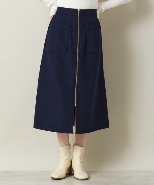 【デザイン】 冬のコーディネートを暖かくお洒落に彩る。 着心地柔らかなジャージーメルトンシリーズ。 起毛をかけたジャージー素材のメルトン調生地を使用。 ウールの様な質感としっかりとした肉感でありながらも、 ジャージー素材なので伸縮性がありかつ柔らかな肌触りが魅力です。 あえて裏地を付けていないので、肌にあたる内側もソフトで温かみのあるタッチ感。 フロントのファスナーデザインがポイントのセミタイトスカート。 タイト過ぎない、Aラインよりの絶妙なシルエットで身体のラインを拾いにくく、かつすっきり見えを叶えてくれます。 ブーツとも相性の良い丈感で、フロント裾にスリットがあるので足さばきも◎ 【素材】 ウールライクなメルトン調のジャージー素材。 伸縮性があり柔らかな着心地です。 【仕様】 ・ポケット数:前×2 ・前ファスナー ・ウエスト後ろゴム ・裏地なし ※アイボリー(004)はやや透け感があるため、インナーの着用をおすすめします。 ※照明の関係により、実際よりも色味が違って見える場合があります。また、パソコン・スマートフォンなどの環境により、若干製品と画像のカラーが異なる場合もございます。 モデル情報:身長166cm B80 W59 H85 着用サイズ:00(フリーサイズ) 店舗へのお問い合わせ商品番号:P93-69514 ●製品寸法: 00(フリーサイズ):W64~68cm H92cm 総丈77cm 備考:
