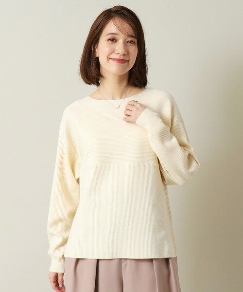【デザイン】 カジュアルからきれいめまで幅広いコーディネートにマッチ。 すっきり見えのボートネックで顔立ち好印象。 リブ編みの切替でシンプルながらもアクセントを効かせたアイテム。 顔周りをすっきりと魅せてくれるボートネックはきちんと感を演出できます。 幅広いコーディネートにマッチするクセのないデザインで、冬のオフィススタイルにもおすすめ。 ハイゲージの適度な肉感でアウターINにも着易く、秋冬~春先までロングシーズンお使いいただけます。 サイドスリット入りなのでタックINでこなれ感を出した着こなしもおすすめです♪ 【素材】 柔らかく弾力のあるリブ編みのハイゲージのニット地です。 ※照明の関係により、実際よりも色味が違って見える場合があります。また、パソコン・スマートフォンなどの環境により、若干製品と画像のカラーが異なる場合もございます。 モデル情報:身長166cm B80 W59 H85 着用サイズ:00(フリーサイズ) 店舗へのお問い合わせ商品番号:P93-19040 ●製品寸法: 00(フリーサイズ):着丈56cm B90cm 袖丈50cm 肩幅45cm 備考:
