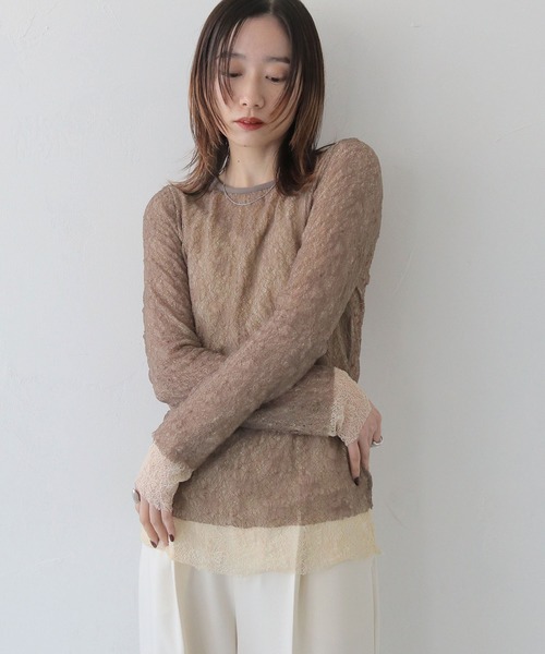 <<<一枚は持っていたい!大人レディなレーストップス>>>【POINT】・レイヤードデザインがポイントのレースシアートップス。・インでもアウトでも可愛く着ていただけます。・柔らかく伸縮性が高いレースを使用しているので、程よいフィット感と、ボディラインも細く綺麗に見せてくれます。・肌が見えすぎず、程よい透け感なのでレディ感もありつつ大人っぽく着こなしていただけます。【STYLING】・一枚で存在感のあるトップスなので、シンプルにタックパンツやデニムなどと合わせていただくだけでコーデが完成します。・寒い時期はジャケットやニットカーディガンのインナーとして使用していただくのもおすすめです。・ローライズボトムスと合わせると、今年らしいトレンドのスタイリングに。・マーメイドスカートやフレアスカート、タイトスカートを合わせると、より女性らしい印象になります。【FABRIC】伸縮性の高い柔らかいレース素材◆透け感:あり◆厚み:薄め◆伸縮性:あり※撮影場所により、実際の色味と若干異なる場合がございます。 あらかじめご了承くださいませ。【お買い物におすすめの便利機能】※商品のお気に入り登録完売カラーの再入荷時や、ラスト1点の時、セール開始時にお知らせ致します。※ブランドのお気に入り登録新商品や再入荷、セール情報等、いち早くブランドのお得な情報を受け取る事が出来ます。ぜひご活用ください。