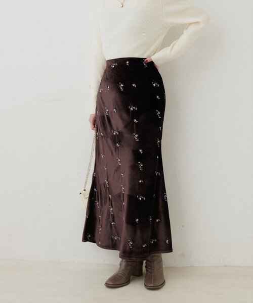 【2024AW natural couture】 1枚で存在感たっぷりのベロアスカート ■Design ベロアの上品な光沢感が魅力のスカートが登場。 滑らかな素材を使用しているので、動く度に女性らしい艶感を引き出してくれます。 裾にたっぷりと布を使ったマーメイド仕様なので 腰回りはすっきりとしながらも足元のボリューム感が◎。 後ろウエストゴムで着脱がラクチンなことに加え、 伸縮性の高い生地なので着心地もラクチン。 全体にささやかな花の刺繍が広がり、可愛らしさもプラスしてくれる1枚です。 ■Styling 存在感のあるアイテムですがどんなトップスにもマッチしやすいのが嬉しいポイント。 ボウタイブラウスやジャケットと合わせてオフィスシーンにもお使いいただけます。 ニットやルーズなカーディガンとお召いただけば、 簡単に冬の大人レディなスタイリングが完成します。 ■Fabric 伸縮性の高いベロア素材。 光沢感がお楽しみいただけます。 ======================= お手入れ方法:手洗い 透け感:なし 裏地:あり ポケット:なし 伸縮性:あり 光沢感:あり 生地感:柔らかく滑らかな生地感 ======================= ※着用、お取り扱いの際は、商品に付いている品質表示とアテンションタグを必ずご確認ください。 【お気に入り登録でお得な情報がいっぱい】 ・「商品のお気に入り登録」で再入荷通知や、ラスト1点の通知、セール通知をいち早く受け取ることができます。 ・「ブランドのお気に入り登録」で新商品や再入荷など、お得な情報を受け取ることができます! ※店舗の入荷時期は商品によって異なります。 店頭の在庫状況につきましては各店舗にてお問い合わせください。 ※撮影時の光の関係で、画面上の画像と実際のお色とでは若干の色差が生じる可能性がございます。 また、ご覧いただいているモニター画面や、お使いのブラウザによっても、お色の違いがございますことをあらかじめご了承くださいませ。 20241122 2024AW_natu 24AW
