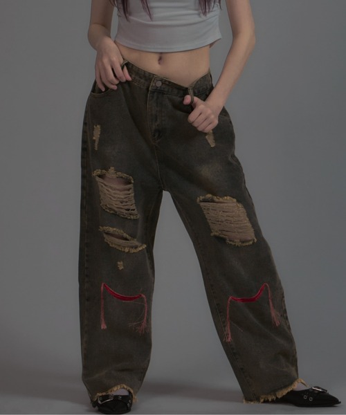 ⁑POINT⁑ ・膝下にレッドカラーの刺繍糸で施された デザインがアクセントのデニムパンツ。 ・ダメージ加工を施しトレンド感をプラス。 ・色落ち加工を採用しヴィンテージ感を演出。 ⁑STYRING⁑ ・ミニTやシアーシャツと 合わせたカジュアルスタイルはおすすめ。 ・人気のメローデザイントップスやキャミワンピと 合わせたスタイルも。 ・足元はキトゥンヒールやサムリングサンダル合わせも。 ・ユニセックスで着用いただけます。 SNS情報 【公式 Instagram】 @tinkerend_official 【公式 TikTok】 @tinkerend_official 新着アイテム&真似しやすくイマドキコーデを発信中♡ tinkerend/ティンカーエンド 「tinker」(ティンカー:試行錯誤する)と「end」(エンド:目的)を組み合わせた造語で創造性や独自性を表現します。自分のファッション個性を自由に表現できるよう、試行錯誤を楽しむことを促進し、差別化を図り独自のファッションスタイルを生み出す体験を楽しめるブランドを目指します。 ■スタッフ着用コメント |身長:159cm|普段サイズ:M (ボトムス)|着用サイズ:L| *着用画像のスタッフです♪ サイズ感:腰・ヒップラインゆったり、足首すっきり 素材感:ダメージ加工でもしっかりな素材感 着心地:しっかりデニムだけどゆったり 〜ひと言コメント〜 裾をだぼっと残して着るなら腰履き、 ピッタリめに着るならハイウエストで履くのがオススメ! どちらでも全体のバランスが綺麗◎ ゴツゴツシューズと合わせると足元の印象UPで個性的に☆ 【ショッピングをよりお楽しみいただくために…】 ▼商品のお気に入り登録♡ マークをクリック! 完売カラーの再入荷・ラスト1点・セール通知などもGETできます! ▼ブランドのお気に入り登録 もし気に入ってくださったら… 新商品や再入荷など、ブランドのお得な情報をいち早くお届けいたします!!