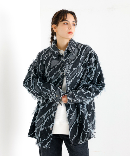ランダムに切り替えたフリンジが特徴t的で男女ともにUNISEXで着れます。トレンドのデニムONデニムルーズシルエットのシャツジャケットで肉厚でがっしりしたデニム生地で、ジャケット感覚のロングスリーブシャツになります。リラックスフィットでエッジの立ったデザインながらもシャツらしく軽快に羽織れるように、ライトウェイトな素材を使用。また、味わい深く加工を施しており、程よくゆとりを作ることでモダナイズされた癖のないシルエットとなっており、厚みを抑えた生地感も相まってスタイリングに非常に落とし込みやすく、頼りがいのある活躍をすること間違いなしです。◆ポイントオールシーズン着用可能。サイズ感は様々なスタイルに合わせやすい適度なビッグシルエット FフリーサイズでMLになります1枚での着用だけでなく、インナーとしても使える万能な1着となっています。◆コーディネート緩めのサイズ感を活かした1枚での着用から春のレイヤードスタイルまで、様々な着こなしが可能な1着です。合わせるボトムはアメカジ定番のデニムやカーゴパンツはもちろんの事、ワイドフレアパンツやトラックパンツなどのストリートアイテムとの相性も◎1枚あるだけでオールシーズン使える1着となっています。【Revo.】音楽、古着、ワーク、ミリタリー etc ...様々なカルチャーやライフスタイルからインスパイアされたアイデアを、素材の風合いを活かしたベーシックアイテムへとアウトプット。シンプルな中にも「匂い」を感じるナチュラルスタイルを提案します。