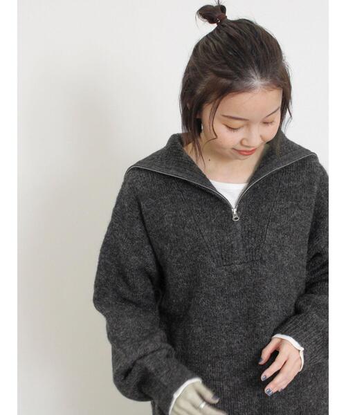 ハーフジップがアクセントになったニットプルオーバー。大きめの襟デザインでさりげなく小顔効果も期待することができます。ゆったりとしたオーバーシルエットで程よくヌケ感があり、こなれ感のあるスタイリングを楽しむことができます。旬のシアーなハイネックインナーを合わせたりと、様々な着こなしのアレンジも楽しめるアイテムです。※商品画像は、撮影環境やお客様のご利用のPC・スマートフォンのモニター環境などにより実物と色味に差異がある場合がございます。