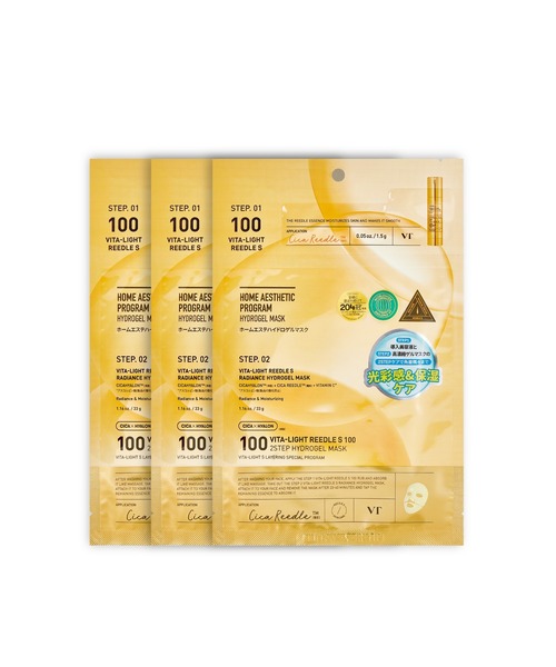 3枚セットでお得!貼る美容液で美肌を叶えるハイドロゲルマスク VT VITA-LIGHT REEDLE S100 2STEP HYDROGEL MASK STEP1 ビタライトリードルS100 VT独自成分CICAHYALON™*と、イギリス産ビタミンC*をカプセルにしたビタカプセル*が弾けながら肌角層に成分を届けます さらに、肌に溜まった角質や老廃物*をケアするCICA REEDLE®*が肌のキメを整えながら美容成分が角層まで浸透する道を作ります ※CICAHYALON™ 整肌成分:ツボクサエキス、マデカッソシド、マデカシン酸、アシアチコシド、アシアチン酸 / 保湿成分:プロポリスエキス、ヒアルロン酸Na ※イギリス産ビタミンC アスコルビン酸(製品の酸化防止) ※ビタカプセル 閉塞剤:トリ(カプリル酸/カプリン酸)グリセリル/溶剤:水、1,2-ヘキサンジオール、BG/親水性増粘剤:グアーガム、カンテン/保湿成分:エチルへキシルグリセリン、ユビキノン、キサンタンガム、トコフェロール、アスタキサンチン、パルミチン酸レチノール/製品の酸化防止:アスコルビン酸 ※老廃物 古い角質と毛穴の汚れのこと ※CICA REEDLE® ツボクサエキス(整肌)、シリカ(スクラブ) What is REEDLE SHOT? 01 整える 毛穴よりも繊細な天然の美容針*が肌を刺激し、肌に穴をあけて美容成分を届ける道をつくる 02 角層へ届ける 上から重ねた美容成分が道を通り、そのまま角層まで届きます 03 健やかに保つ 角層まで美容成分がしっかりと行き渡り、スキンケア効果を実感 ※シリカ(スクラブ) STEP2 ビタライトリードルS ラディアンスハイドロゲルマスク 乾燥くすみ肌にアプローチする高濃縮のエッセンス1本分がギュッと固まったゼリー状のゲルマスク 肌にしっかりフィットしで美容成分がやさしく溶け込む 時間が経つとともにシートの色がどんどん薄く透明になるのは、肌に美容成分が届いている証拠! 乾燥くすみ肌にアプローチ!輝くツヤ肌に導くサブ美容成分 メラゼロ®V2:ビワ葉エキス、ミドリハッカエキス(いずれも保湿) ビタミンE:トコフェロール(保湿) ナイアシンアミド(5%):保湿成分 グルタチオン:保湿成分 【使用方法】 1)夜の洗顔後、素肌にSTEP1ビタライトリードルS100を適量、マッサージするように肌になじませます。 2)STEP1ビタライトリードルS100をなじませたあと、STEP2ビタライトリードルS ラディアンスハイドロゲルマスクを取り出し、フィルムを取り上部は目を中心に、下部は口を中心に輪郭に合わせ、密着させます。 3)約20~40分後、マスクを取ります。肌コンディションに合わせて使用時間を調節します。 【TIP】毎日変わる肌コンディションに合わせてオーダーメイド級のケアを! クイックケア➡20~40分 じっくりケア➡2~3時間 リードルS 使用時の注意事項 商品画像にございます注意事項をよくお読みの上ご使用ください。 ・美容デバイスとの併用NO ・保湿ケアが美肌へのカギ ・避けて使用すべき箇所 ・外出前の日焼け止め必須! ・使用時のチクチク感!差があります ・リードルショット使用TIP 【使用上のご注意】 1.お肌に異常が生じていないかよく注意して使用してください。 化粧品がお肌に合わないとき即ち次のような場合には、使用を中止してください。そのまま使用を続けますと、症状を悪化させることがありますので、皮膚科専門医等にご相談されることをおすすめします。 (1)使用中、赤味、はれ、かゆみ、刺激、色抜け(白斑等)や黒ずみ等の異常があらわれた場合 (2)使用したお肌に、直射日光があたって上記のような異常があらわれた場合 2.傷やはれもの、しっしん等、異常のある部位にはお使いにならないでください。 3.目に入った時は、直ちに洗い流してください。 4.保管及び取扱い上の注意 (1)開封後はお早めにご使用ください。 (2)乳幼児の手の届かないところに保管してください。 (3)高温又は低温の場所、直射日光のあたる場所には保管しないでください。